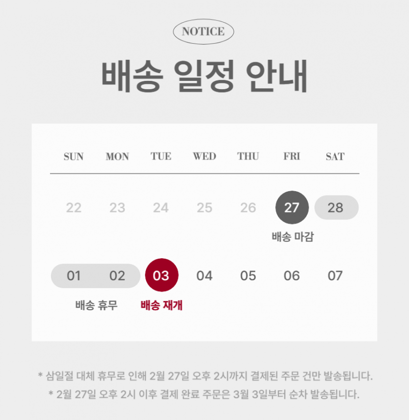 2026년 삼일절 연휴 배송 안내 페이지 정보 작성자 엠에스글로벌바이오 댓글 0건 조회 153회 작성일 26-02-10 10:43 목록 답변 본문 3월 2일 대체 휴무일 지정으로 인해 금요일 오후 2 시 이전 주문 건까지 출고 가능하며, 이후 주문 건은 3월 3일 순차 출고됩니다. 다음글2025년 추석 연휴 배송 안내 25.09.25 댓글 0 댓글목록 등록된 댓글이 없습니다.